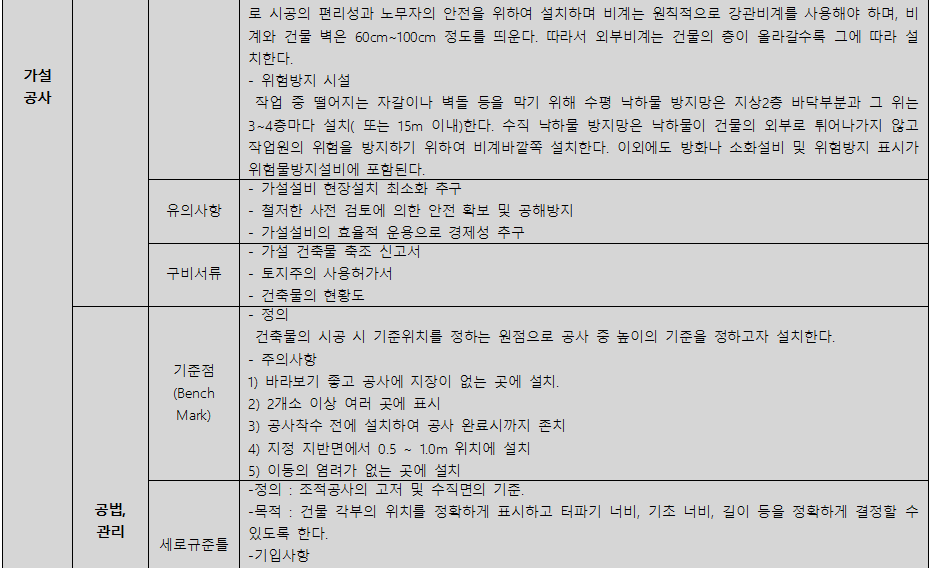 규준틀, 기준점, 시멘트 창고, 각종 방지대책, 각종 비계가 주로 출제됩니다. 가설공사의 대부분이긴 하지만 각키 워드의 핵심만 외운다면 다음은 연상이 가능하기 때문에 내용을 압축하기 쉽습니다.