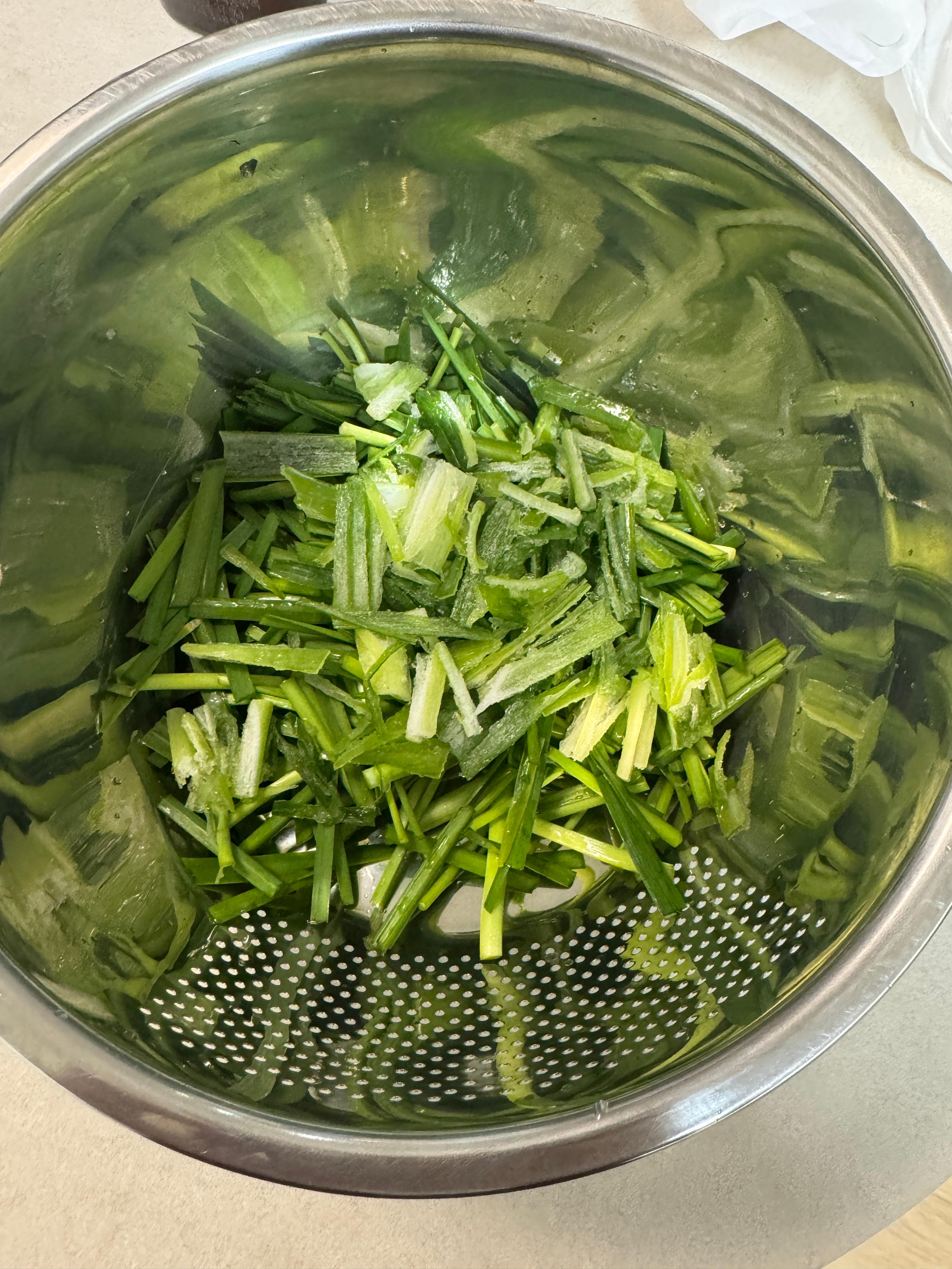 4. 부추는 새끼손가락 길이대로 다듬어주시고 대파의 파란 부분도 같은 크기로 손질해 줍니다.