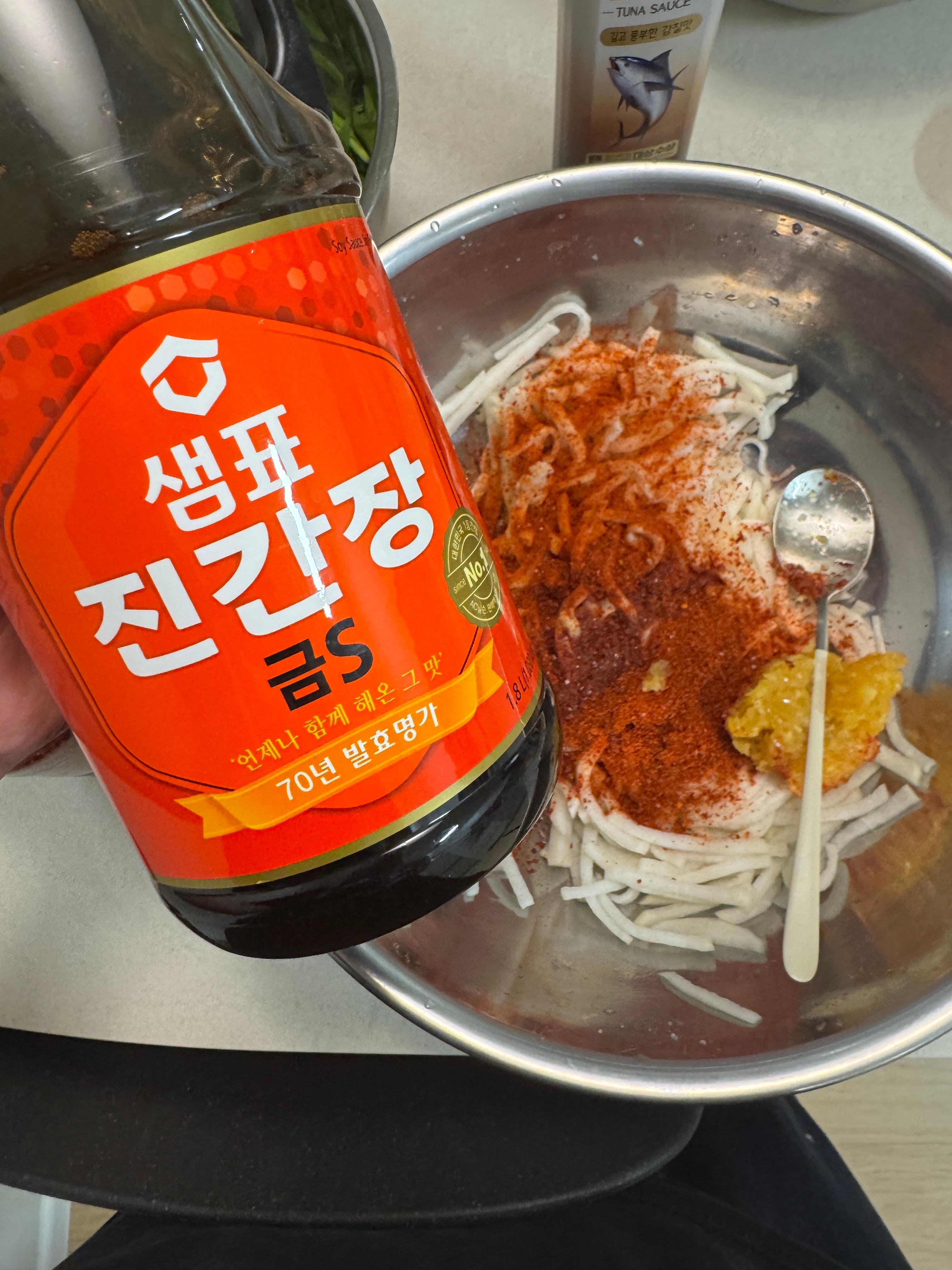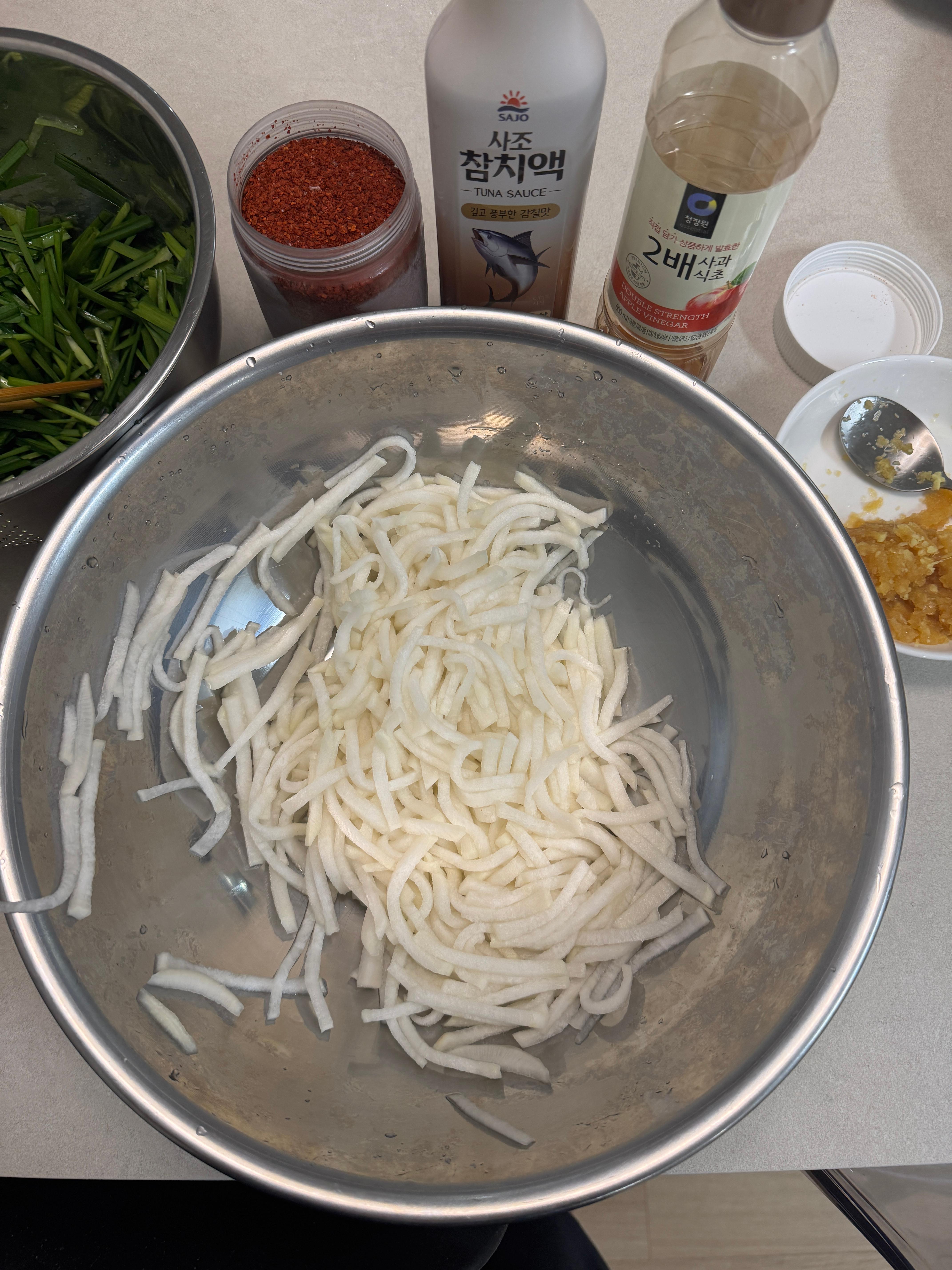 7. 절여진 무에, 섞어둔 다진 마늘, 생강을 3 수저, 고추가루 3수저, 설탕 한 수저, 식초 한수저, 간장 한수저, 참치액젓 한수저, 손질된 부추, 대파 한 줌을 넣고 섞어줍니다.
